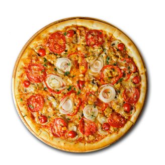 Paneer, Mushroom, Sweet Corns, Mozzarilla sausage and red paprika toppings on a new spicy peri peri sauce base. Spiciest non veg pizza with spicy & herby chicken Onion Capsicum,